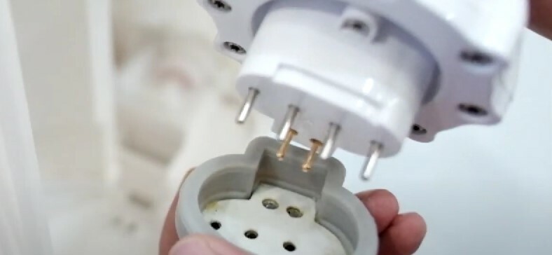 拆開新濾心包裝之後,將燈匣底座對好 2 PIN 和 4 PIN的接孔並裝上。燈匣及活性碳對準上方卡榫後,依序以逆時鐘方向轉1/4圈向上轉回,即完成3M UVA3000 換濾心步驟。