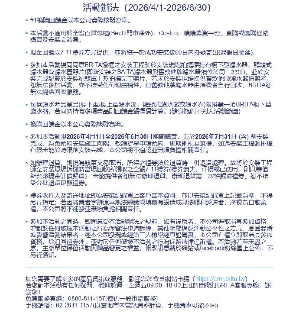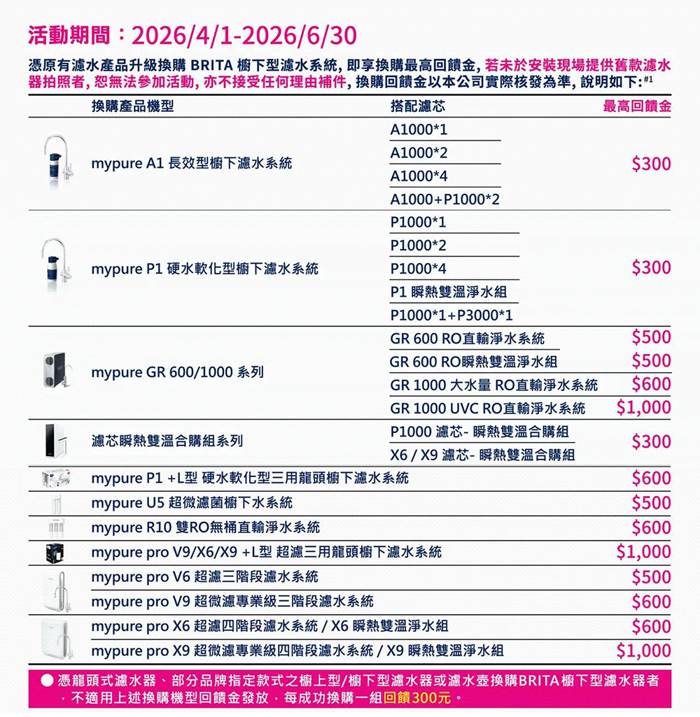 舊換新活動:憑原有濾水產品升級換購BRITA櫥下型濾水系統,立即獲得最高1,000元回饋金!