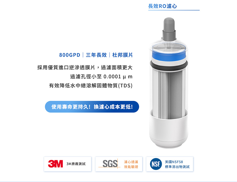.三年長效濾心,進口RO膜 800GPD,過濾孔徑小至 0.0001 µm