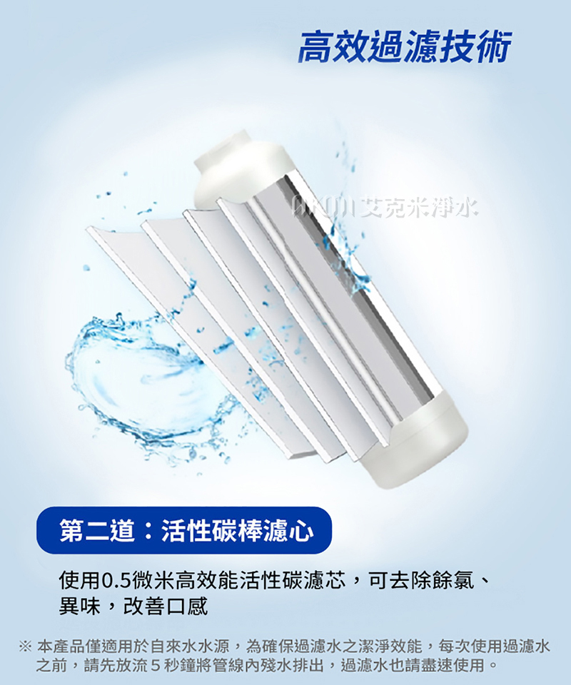 • 運用0.5微米高效能活性碳濾心過濾餘氯、異味、鐵鏽等