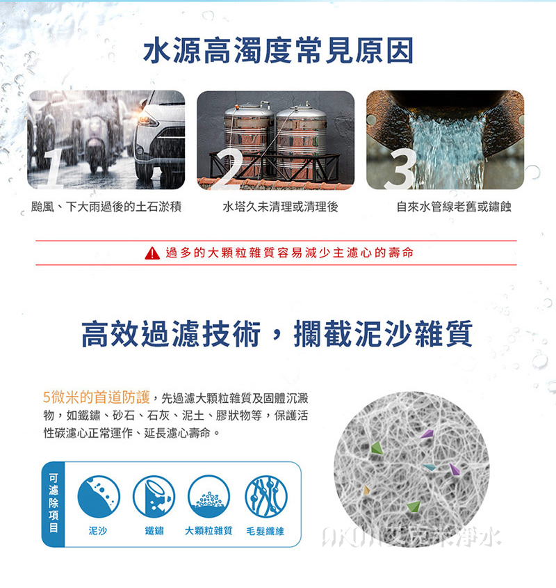 • 先行過濾粗粒子及固體沉澱物,保護活性碳濾心過濾功能正常運作