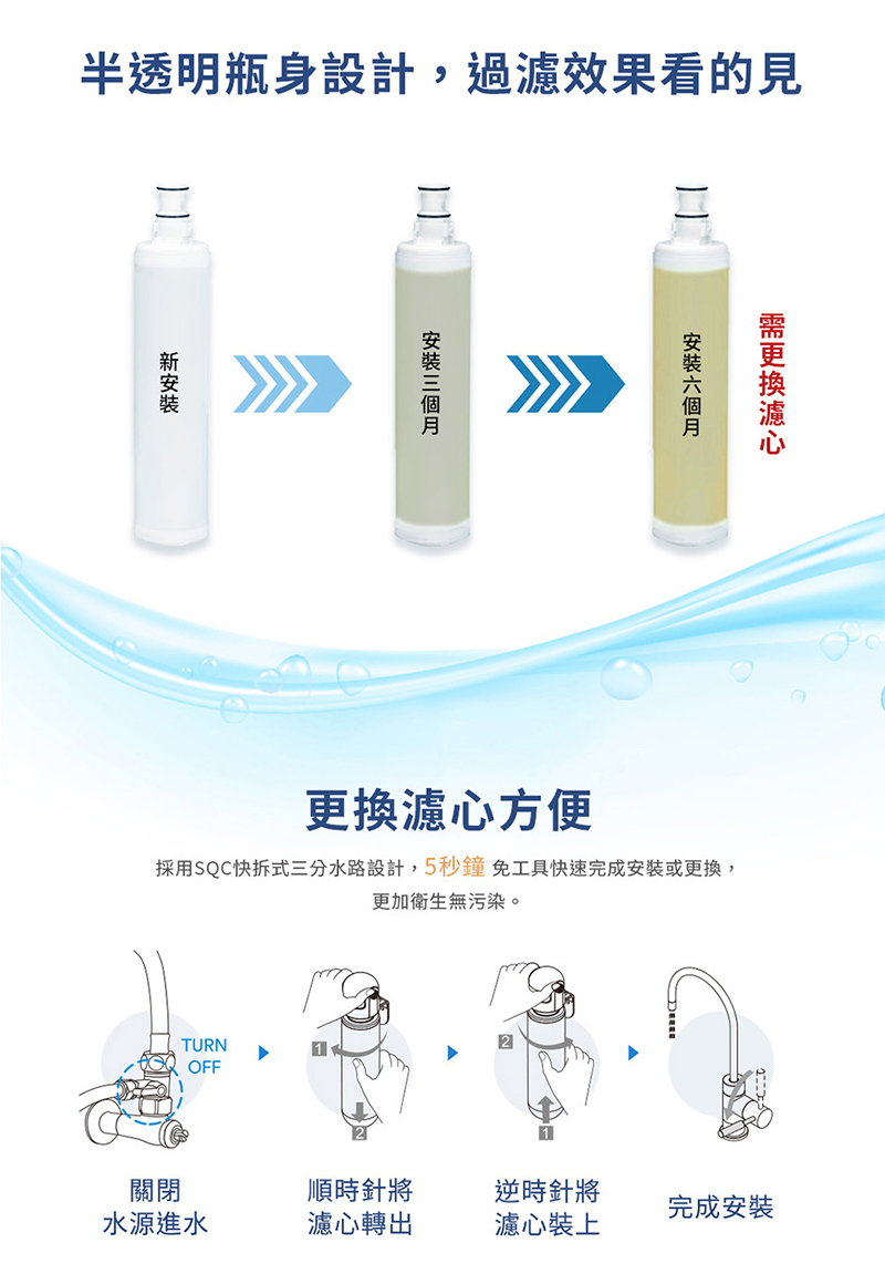 . 3M SQC快拆前置PP過濾系統採半透明瓶身設計,過濾效果的見