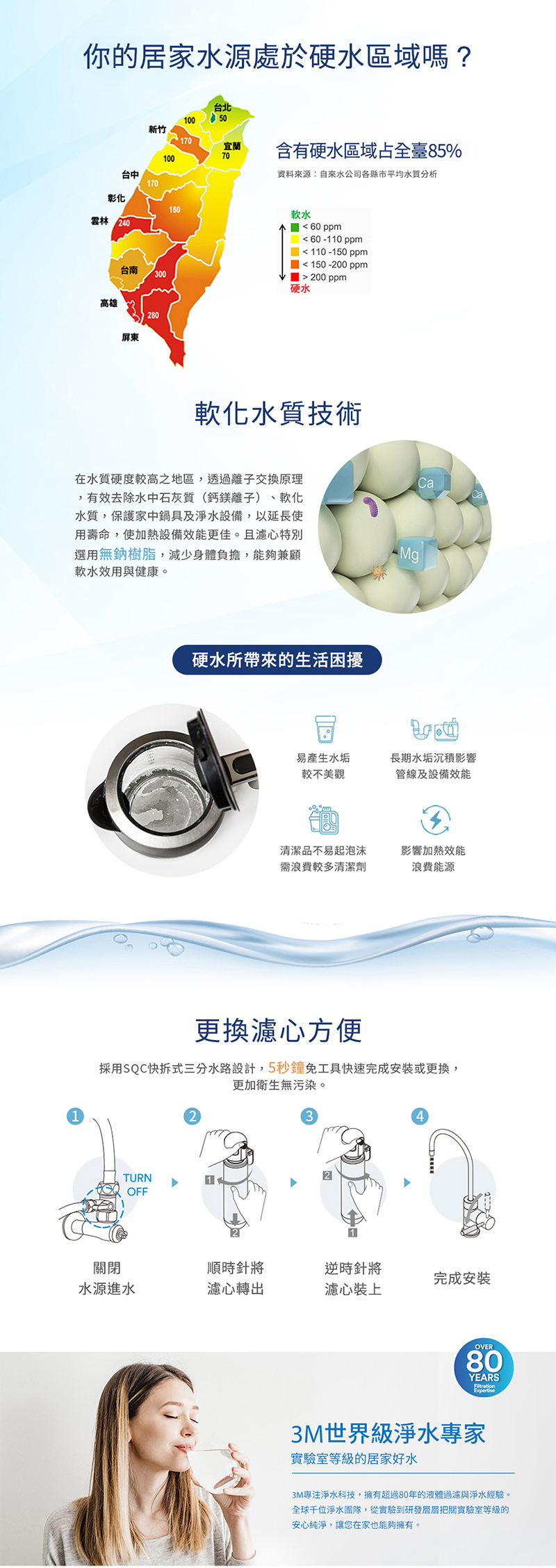 . 3M SQC快拆前置無鈉樹脂軟水系統能有效減少水垢生成、軟化水質,提升飲用口感