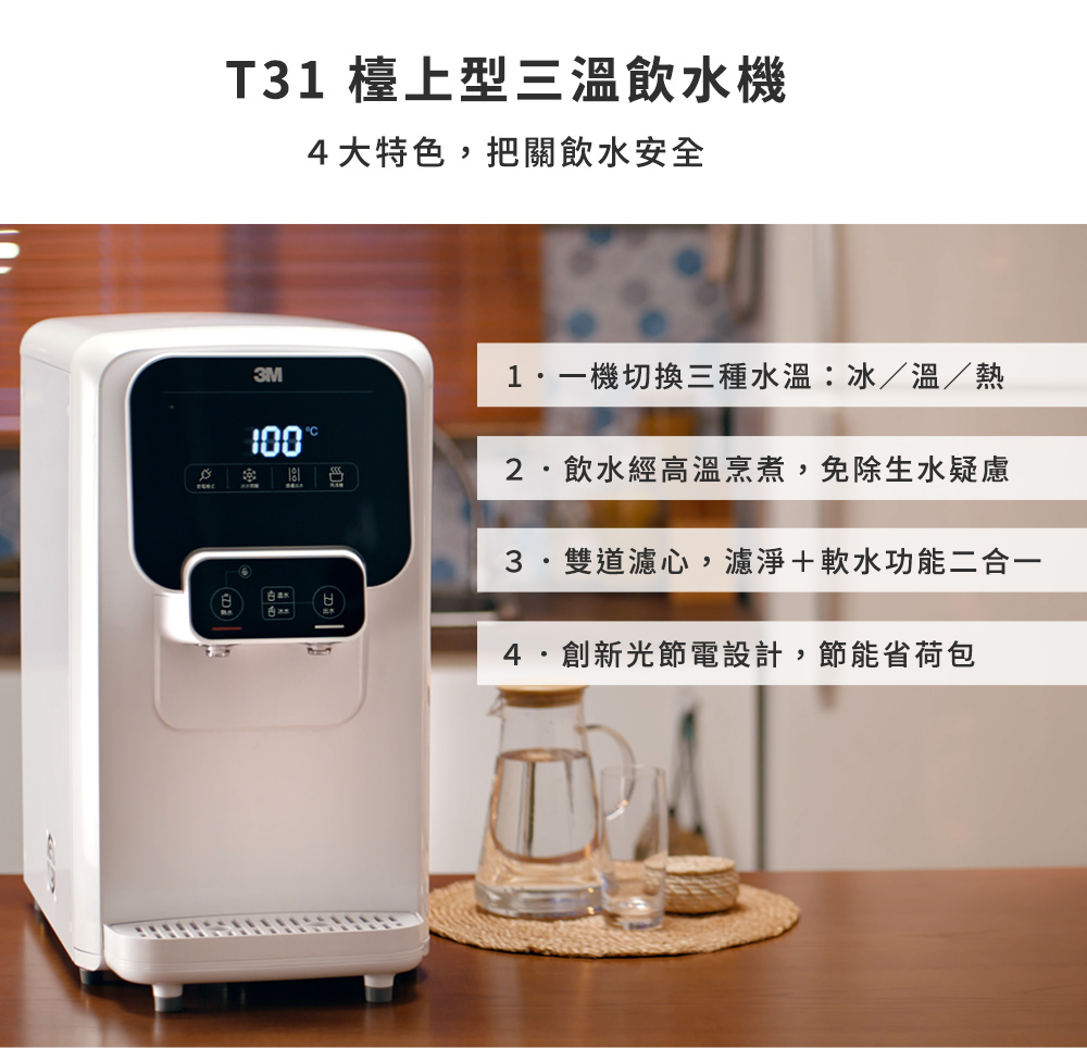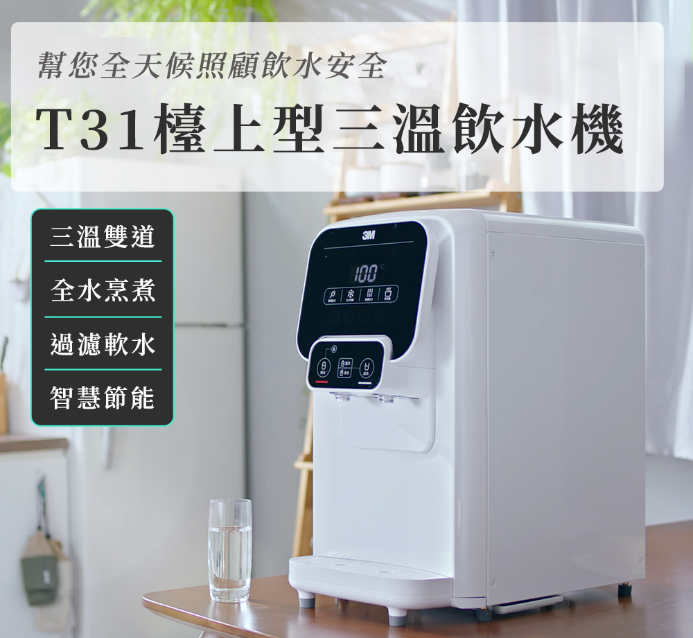 3M T31 檯上型三溫飲水機採用一體式拋棄型更換濾心,不重複使用,更換濾心只需短短1分鐘,方便衛生,不需輔助扳手,不需專人到府。