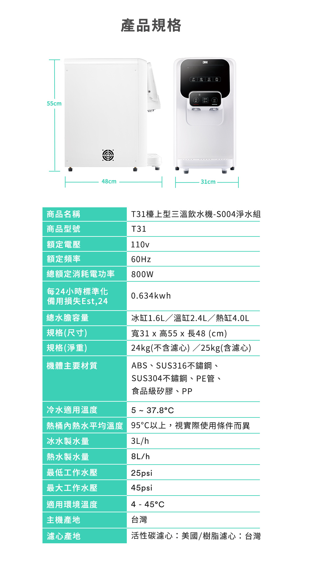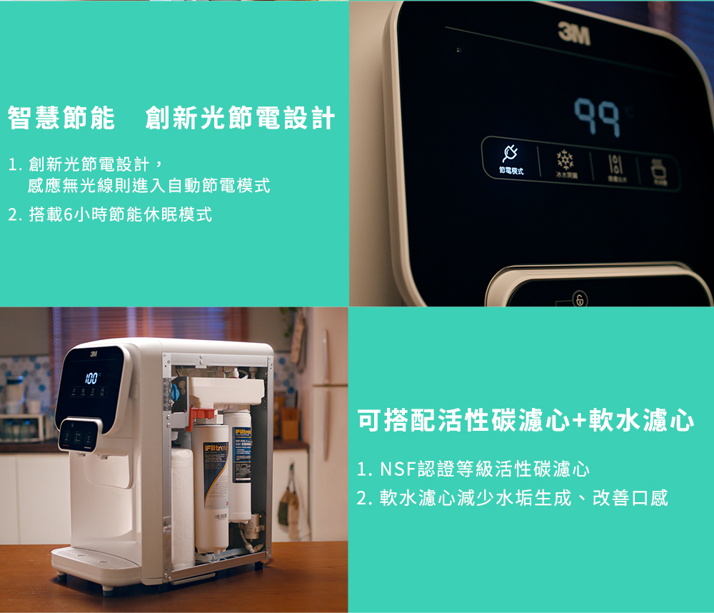 3M T31 檯上型三溫飲水機採用高密度活性碳棒 (3US-F004-5)和無鈉樹脂濾心 (3RF-F001-5) 雙道濾心組合。活性碳濾心若達總過濾水量為7571公升(或12個月)則需進行更換,無鈉樹脂濾心達總濾水量為400-900公升(或2-4個月)則需進行更換。*在水質較差或硬度較高的地區,使用後水流量明顯減少時,需更換活性碳濾心。*煮水後開始出現白色水垢,需更換樹脂濾心。