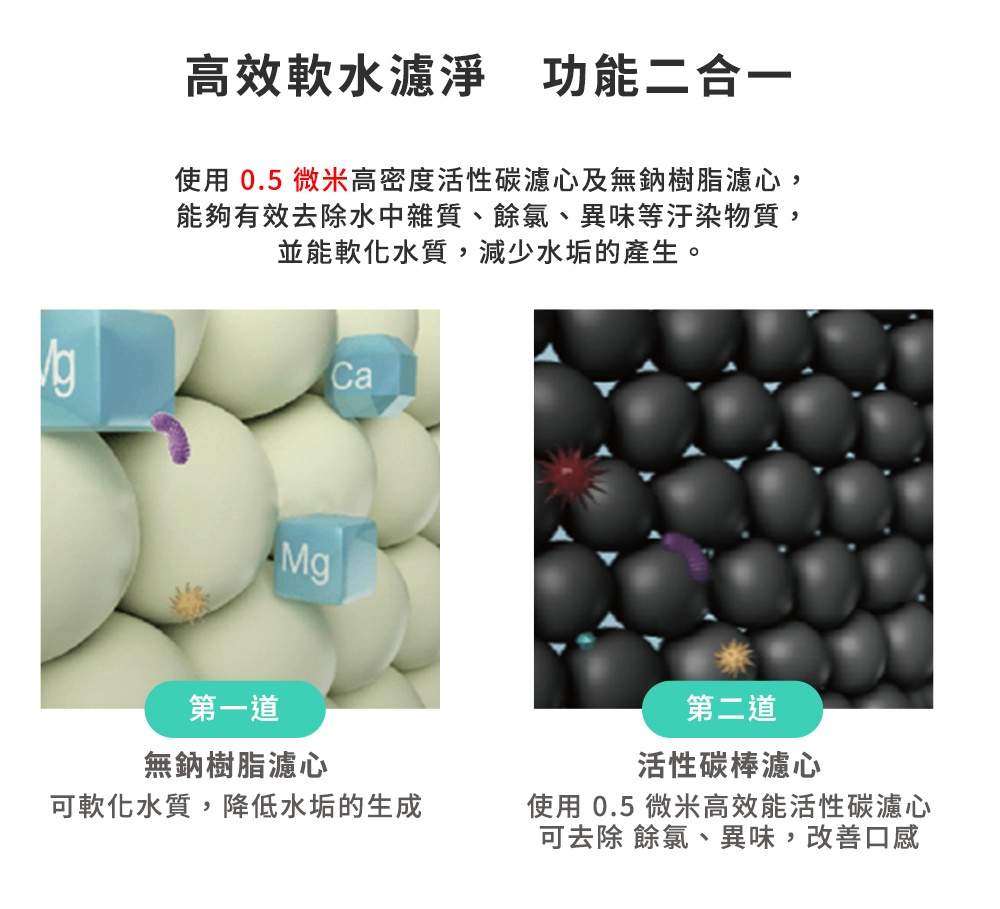◆搭載雙道濾心,濾淨、軟水功能二合一