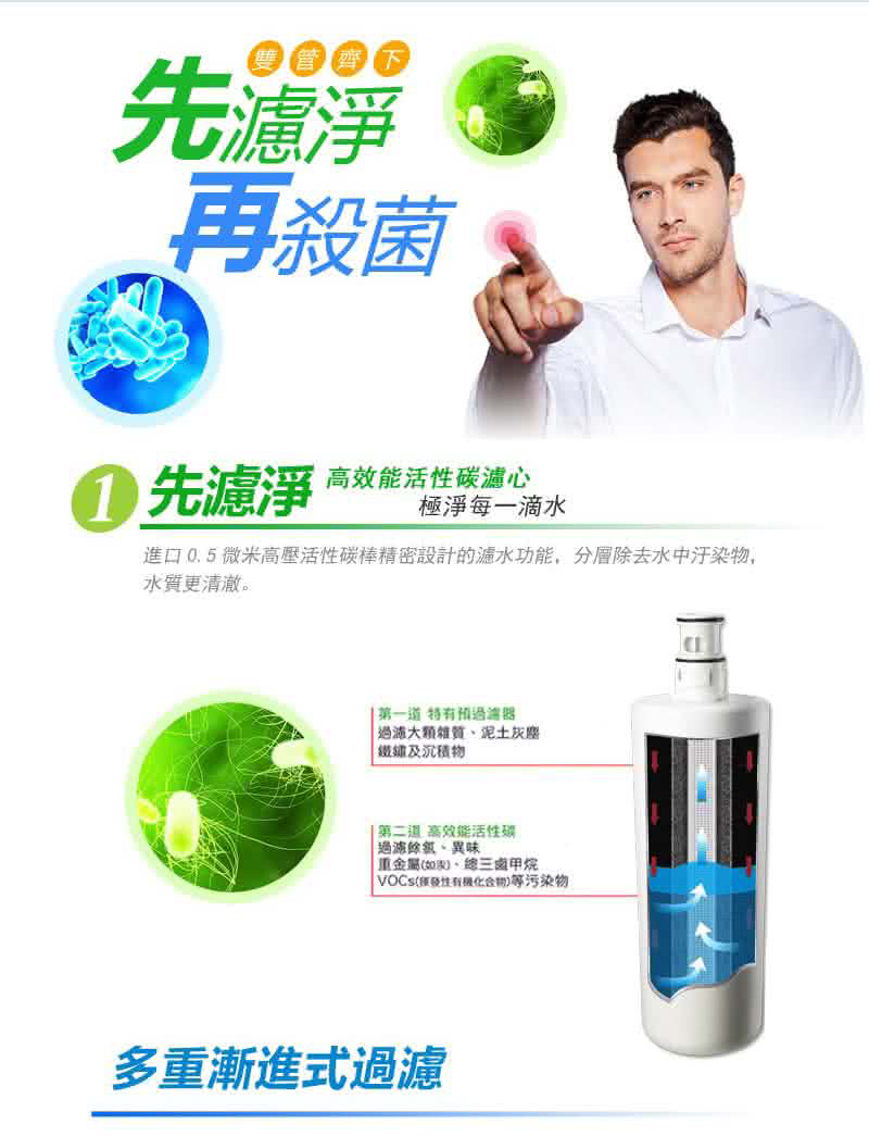 • 過濾量大之長效濾芯,安心飲用一整年。