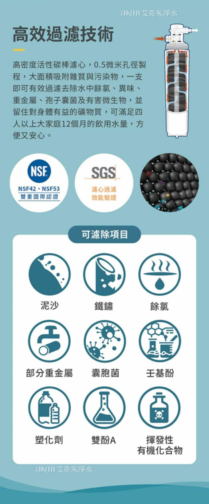 ‧ NSF雙認證:高效能活性碳,濾除異味,可生飲。