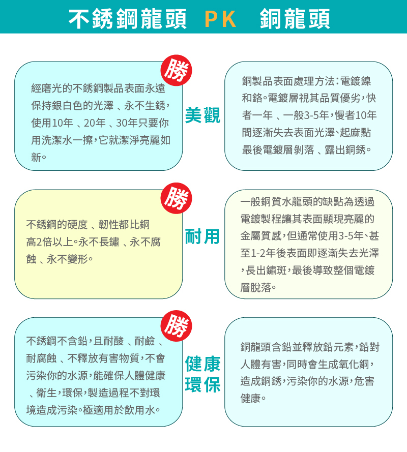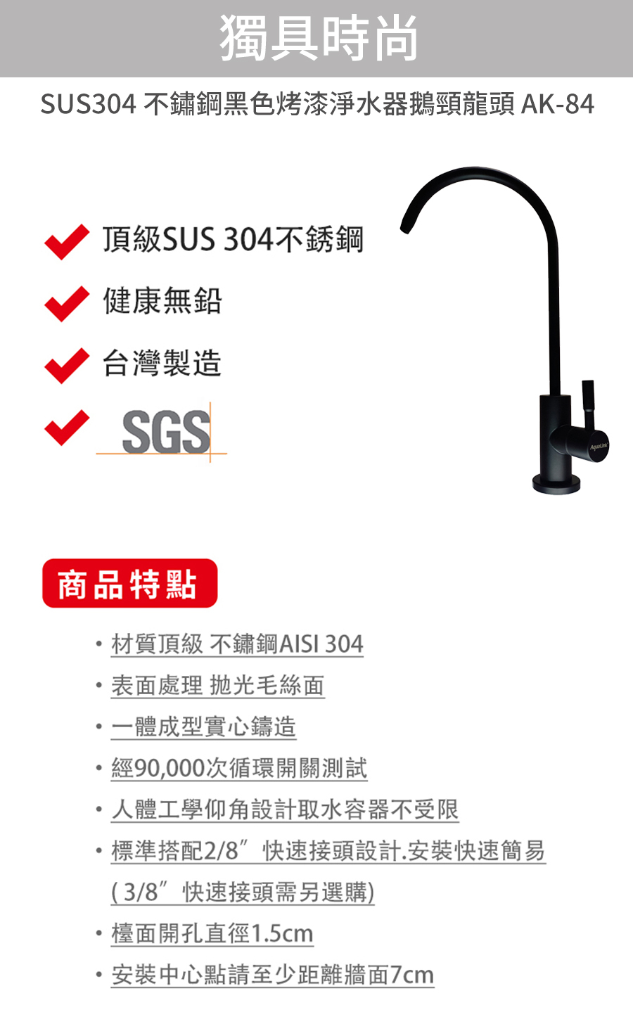 ・水龍頭由內到外都是AISI 304頂級不鏽鋼打造。從安裝的零件、管線到表面,一律使用相同頂級的鋼材。含有高含量抗氧化元素「鉻」,以及抗酸蝕、抗鏽蝕貴金屬「鎳」核心元素。不僅質感光亮優雅,對人體更不會有任何負擔。・AK-84不鏽鋼淨水鵝頸水龍頭不會有掉漆掉色、生銅綠、鏽蝕等問題。溫差大、鹽分高的戶外和各種嚴苛環境,都適合AK-84。・100%由不鏽鋼打造,細膩的手工打磨,研磨出細緻的毛絲面,讓不鏽鋼沉穩的質感更上層樓,耐用程度更是一般電鍍水龍頭的2倍以上。不論是搭配任何類型的廚具甚至是室內設計,都有令人意想不到的契合感。・免除所有過濾水後2次汙染的鉛疑慮。總覺得喝水不放心?那就選擇完全沒有鉛的不鏽鋼龍頭吧!
