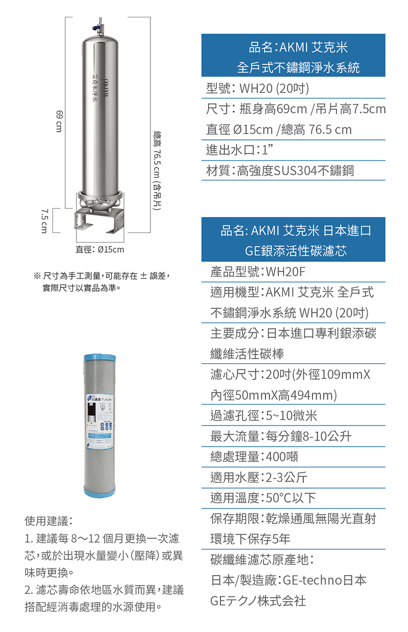 適用:AKMI 艾克米 全戶式不鏽鋼淨水系統 WH20 (20吋)