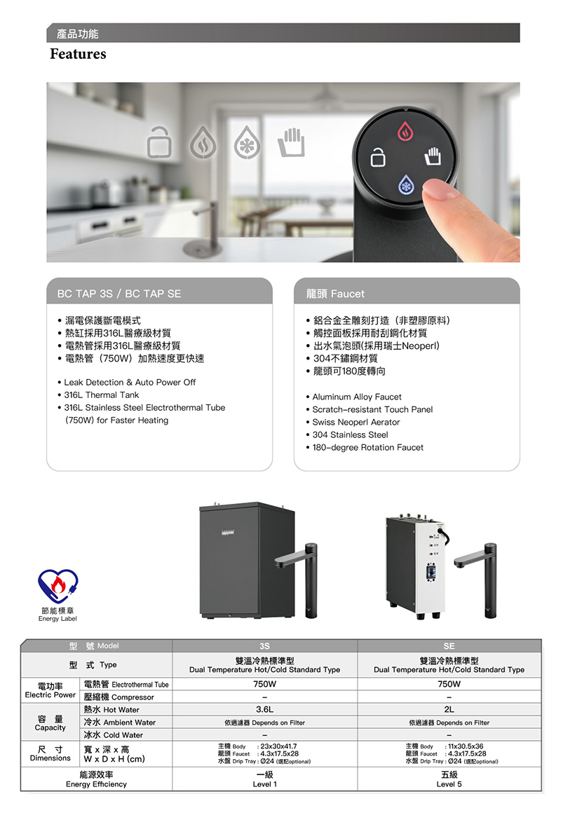 .龍頭部分採用鋁合金全雕刻打造,並配備耐刮鋼化觸控面板、瑞士Neoperl氣泡頭及304不鏽鋼材質,龍頭可180度轉向。