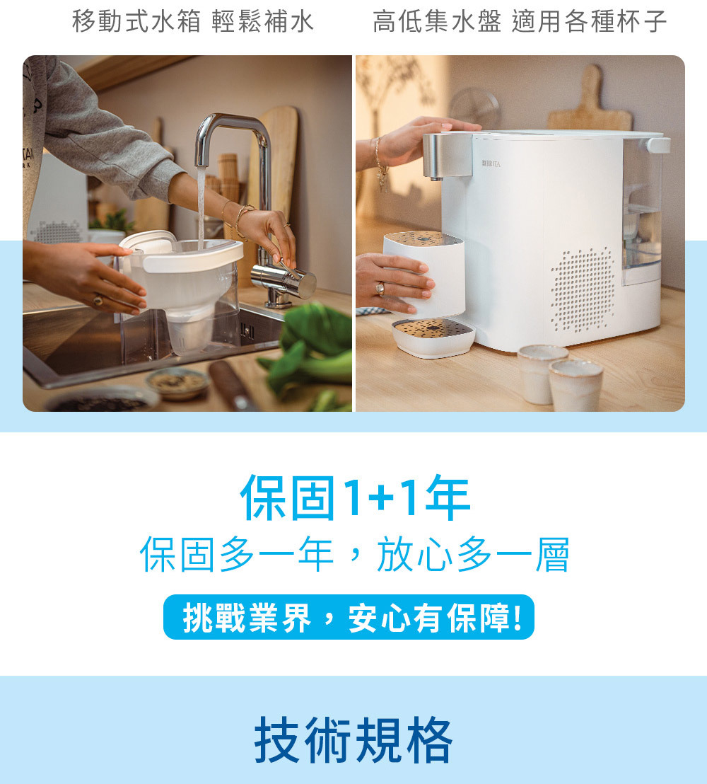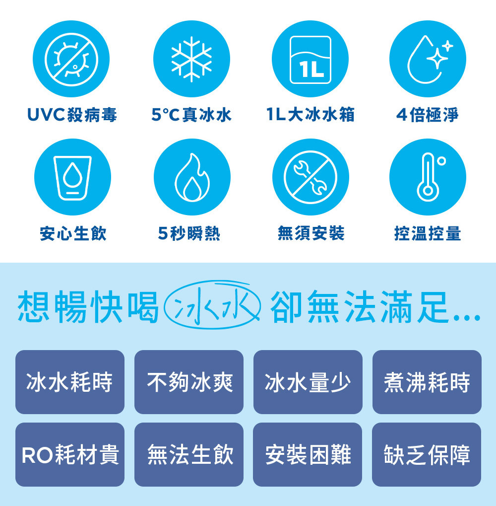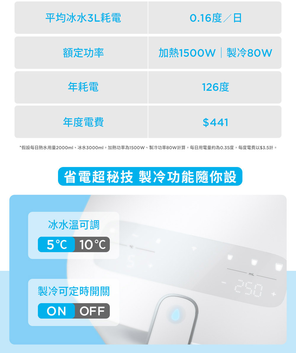 符合台灣110V的電壓、插座。放置非常方便且免安裝,非常適合租屋處/小家庭/辦公室使用,以及喜歡喝冰水+熱飲的人、不想安裝RO淨水設備者。