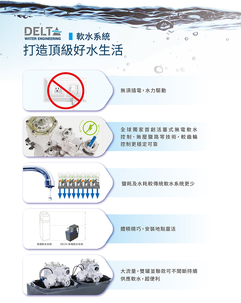 ・無需用電,整體控制基於用水流量,而且鹽耗和水耗更少,更有利於環保。