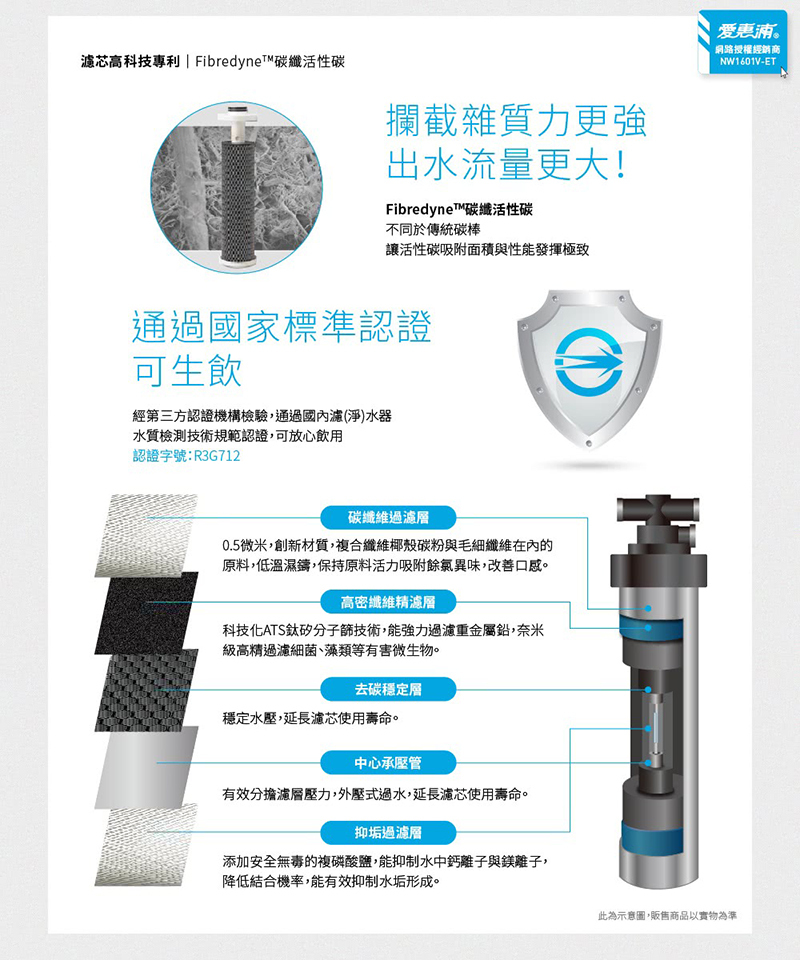 * 第二層 高密纖維精濾層:科技化ATS鈦矽分子篩技術,能強力過濾重金屬鉛,奈米級高精過濾細菌,藻類等有害微生物。