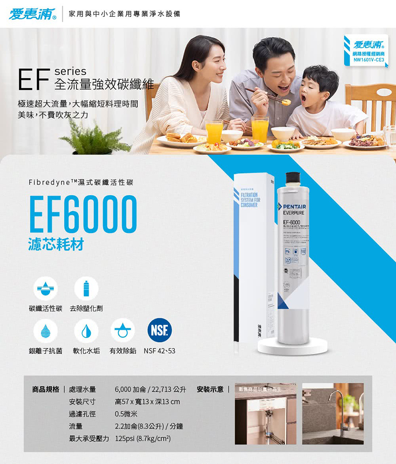 • 品名:EF6000 全流量強效碳纖維濾心• 尺寸:56 x 13 x 13 cm• 過濾孔徑:0.5微米• 最大允許壓力:125 psi• 總處理量:22,713公升• 流量:8.3公升/分鐘