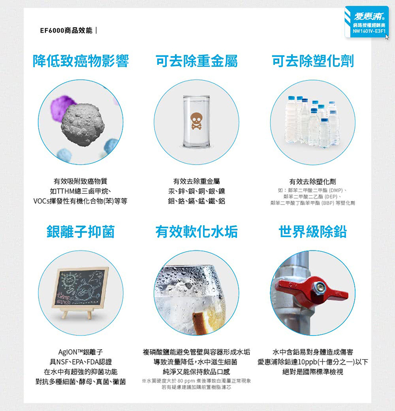 • 搭多效合一,兼備除鉛、軟垢、銀離子抗菌,還可去除塑化劑、重金屬等有害物質,有效吸附TTHM總三鹵甲烷、VOCs揮發性有機化合物(苯)等致癌物質• 採用安全無毒的複磷酸鹽,能有效抑制水垢,保持高品質口感風味• 採用 Fibredyne™ 濕式碳纖活性碳,形成高效濾水功能,有超高處理量與高流量效能,適合家中人口眾多或愛烹飪的你• 台製無鉛不鏽鋼304龍頭,同時搭配大出水量設計• AgION™銀離子抑菌功能,對抗水中多種類型的細菌、酵母、真菌、黴菌• 0.5微米過濾力• 即開即飲,免煮開水節省瓦斯費• 碳纖活性碳、去除塑化劑、銀離子抗菌