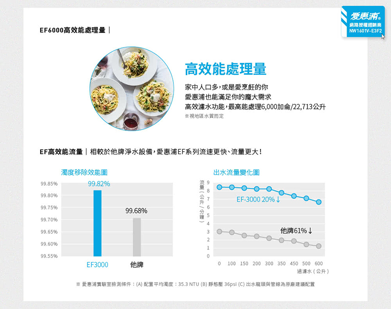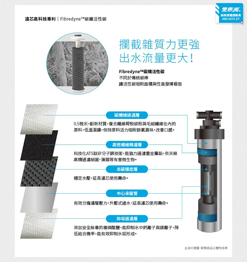 • 採用 Fibredyne™ 濕式碳纖活性碳,形成高效濾水功能,有超高處理量與高流量效能,適合家中人口眾多或愛烹飪的你