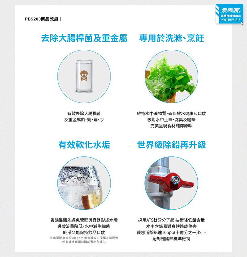 • 採用ATS鈦矽分子篩技術降低鉛含量,而此款濾心的除鉛達10ppb(十億分之一)以下,絕對是國際級標準檢視