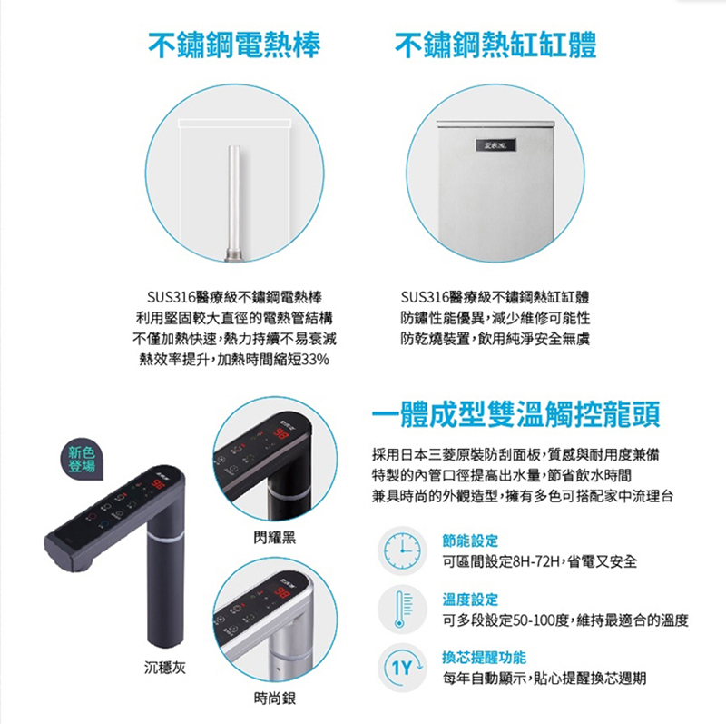 • 316不鏽鋼加熱技術+一體成型雙溫觸控龍頭。