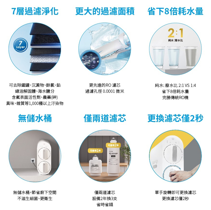 僅2道濾心 設備2年換芯3支 省時省錢!*G2-CF前置濾芯:2 合 1 複合式濾芯,PP 過濾層+活性碳過濾層(可使用1年)*G2-MRO 濾芯 :複合式濾心科技,去除多種汙染源。可有效過濾鉛、總溶解固體(TDS)、海水鹽分、含氟表面活性劑(PFAS)、氟化物、肥料、有害化學物質。(可使用2年)