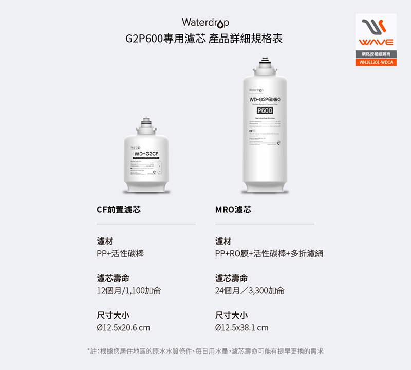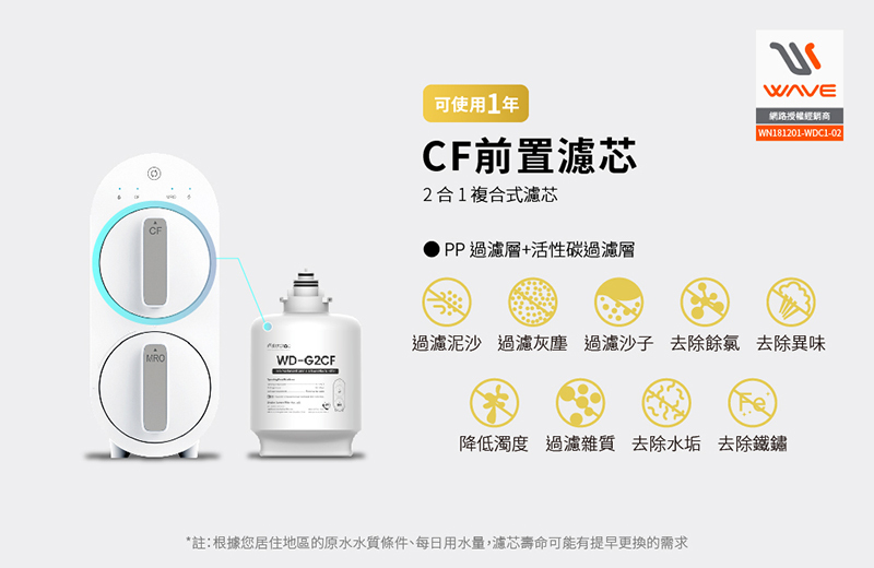 *G2-CF前置濾芯:2 合 1 複合式濾芯,PP 過濾層+活性碳過濾層(可使用1年)