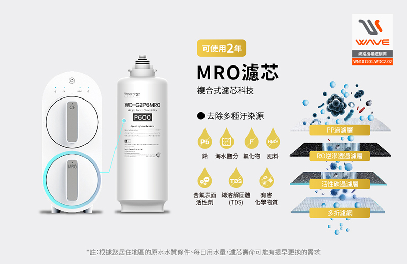 *G2-MRO 濾芯 :複合式濾心科技,去除多種汙染源。可有效過濾鉛、總溶解固體(TDS)、海水鹽分、含氟表面活性劑(PFAS)、氟化物、肥料、有害化學物質。(可使用2年)