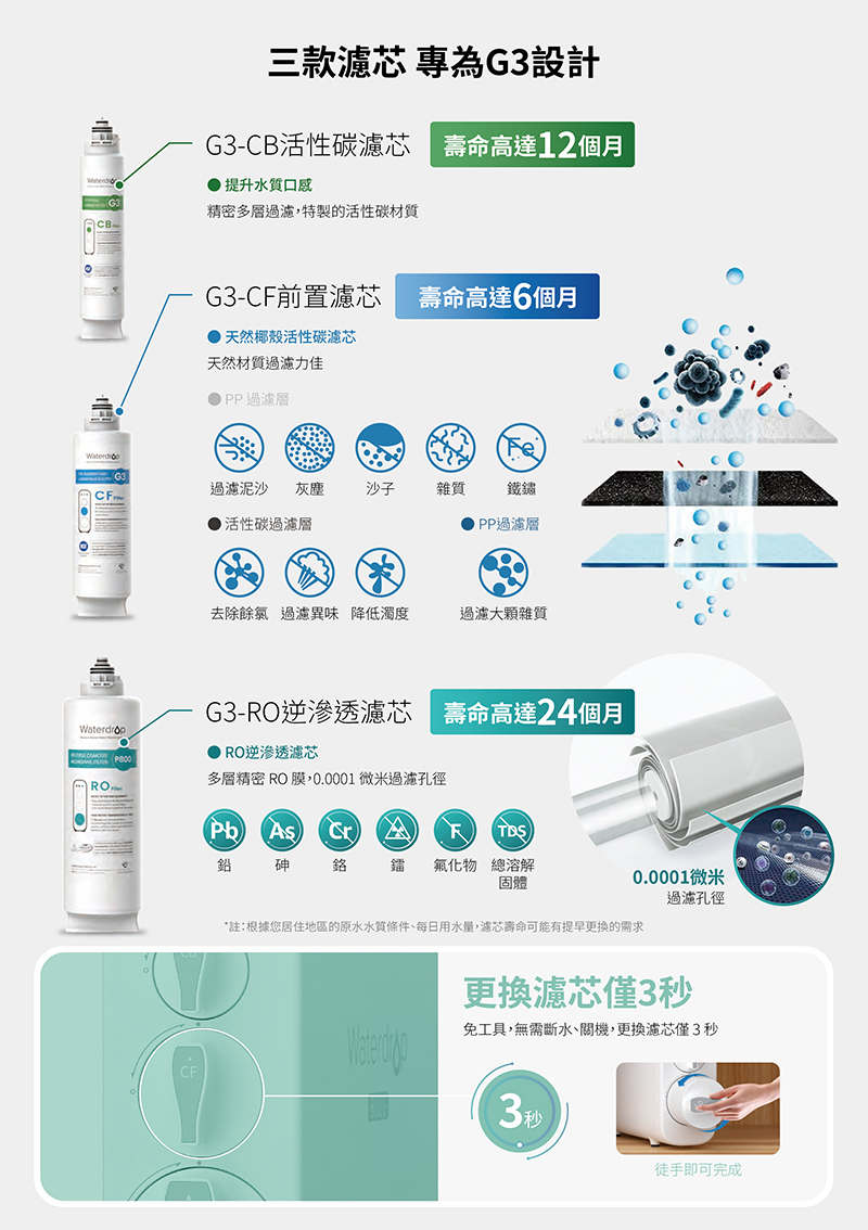 *G3-RO逆滲透濾芯 :RO逆滲透濾芯,多層精密 RO 膜,0.0001 微米過濾孔徑(壽命高達24個月)