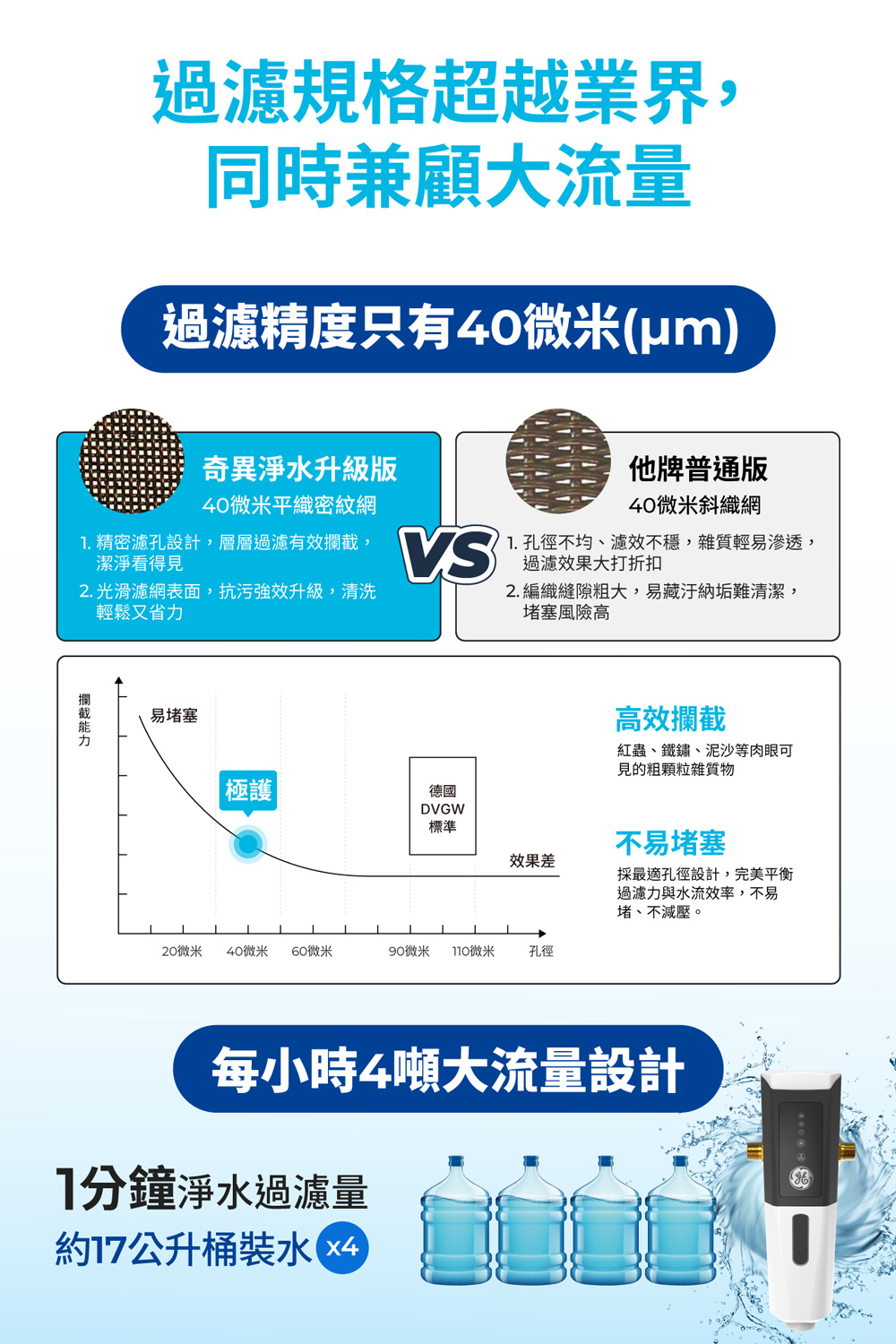 .40微米高精度過濾:有效攔截泥沙鐵鏽,濾芯不易堵塞,保護家電。