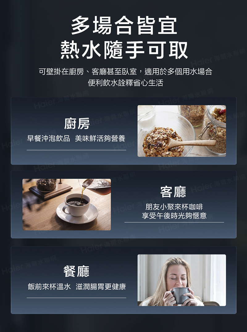 海爾RO淨水器搭配瞬熱飲水機可安裝於多元環境中,以滿足各種用水需求,提升生活的便利性* 實際安裝需求仍以現場實際評估環境需求為主