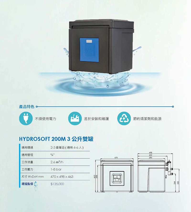 ・採用歐洲高純度銅鑄件與優質耐壓材料。專利全吸除式反洗,反洗時完全不停水,水量消耗極低。