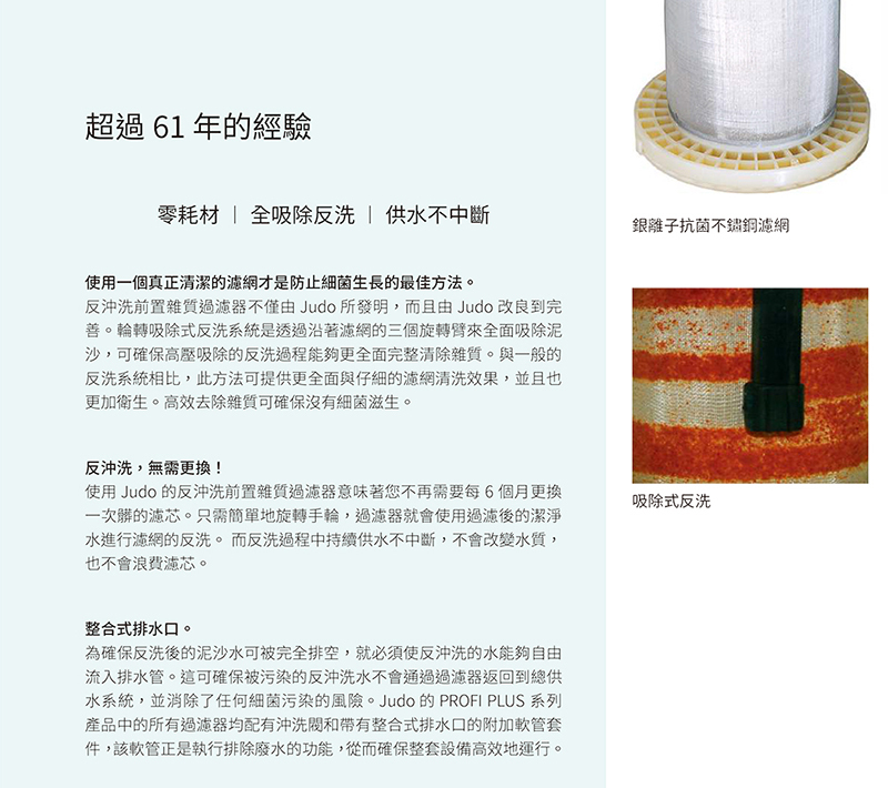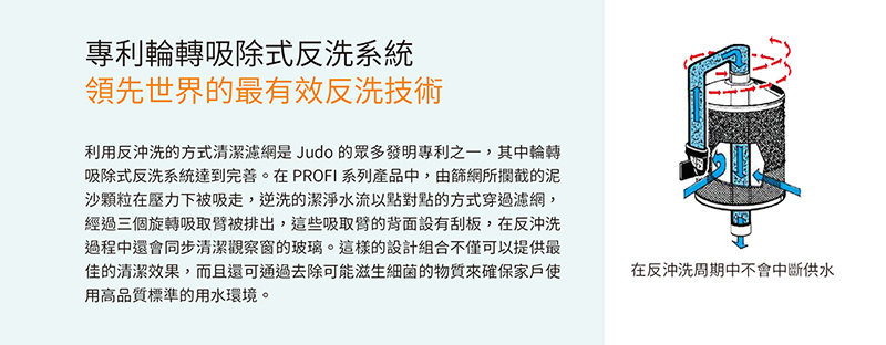 ‧ 專利全吸除式反洗,反洗時完全不停水,水量消耗極低