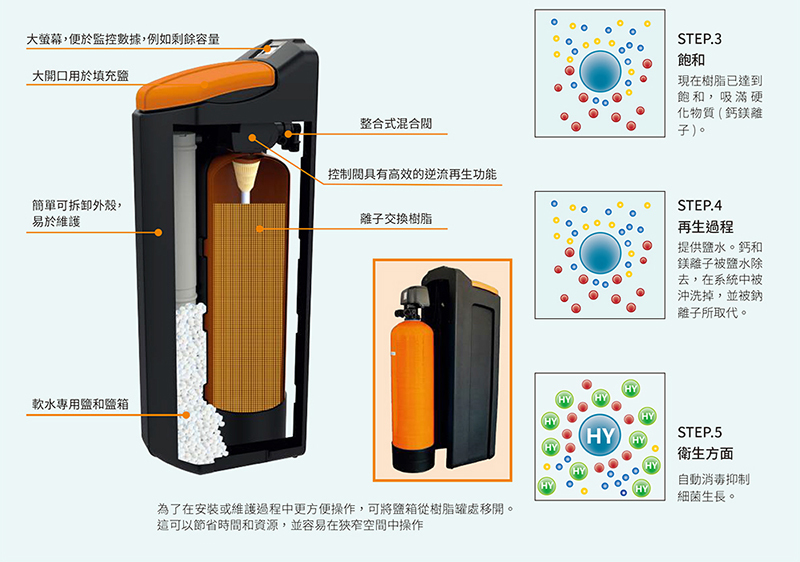 ‧ 單罐式美泉軟水機 SOFT-40:自動設定流量與活化,使用食品級均粒離子交換樹脂,質感好水,養膚必備