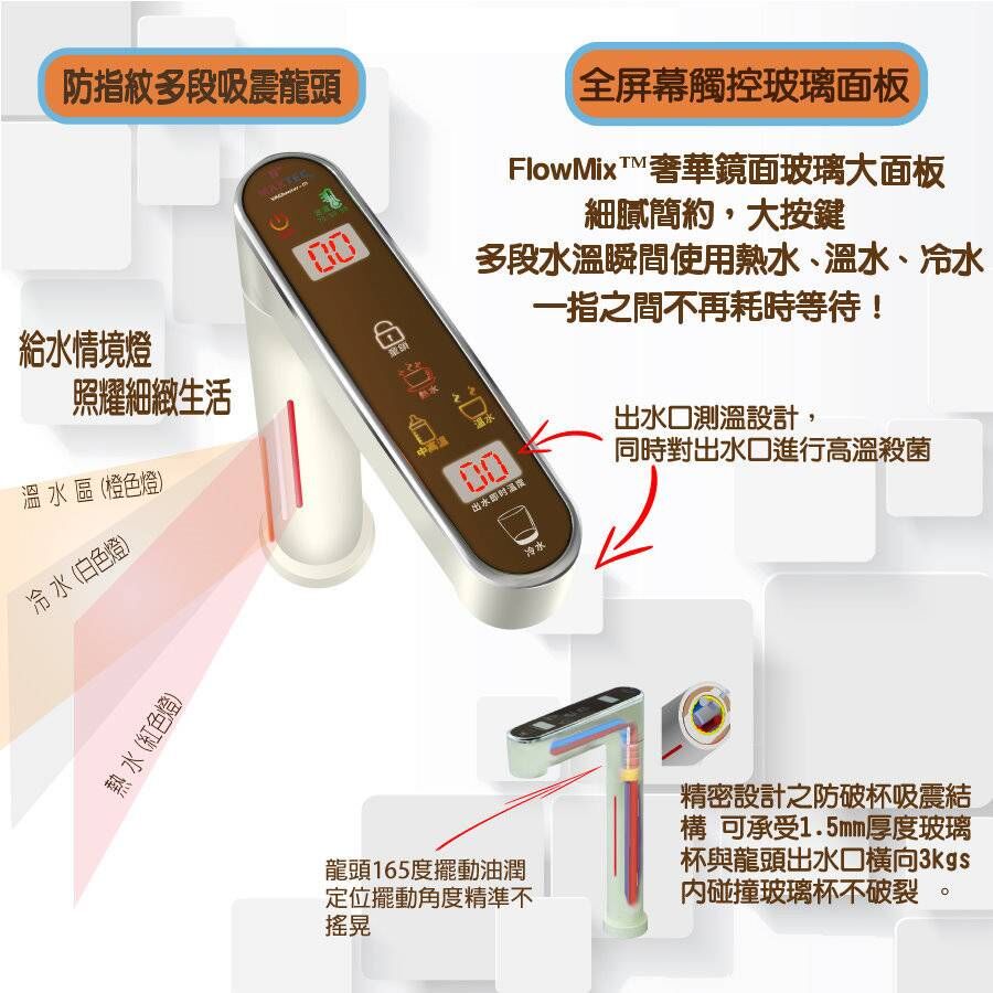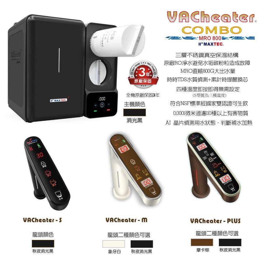 VACheater COMBO-M 有「冷水 / 溫水 / 中高溫 / 熱水」四種即時溫度可以使用;龍頭上方有雙重顯示溫度螢幕 (可以顯示即時出水溫度);龍頭及機身顏色為「象牙白、秋夜消光黑」。
