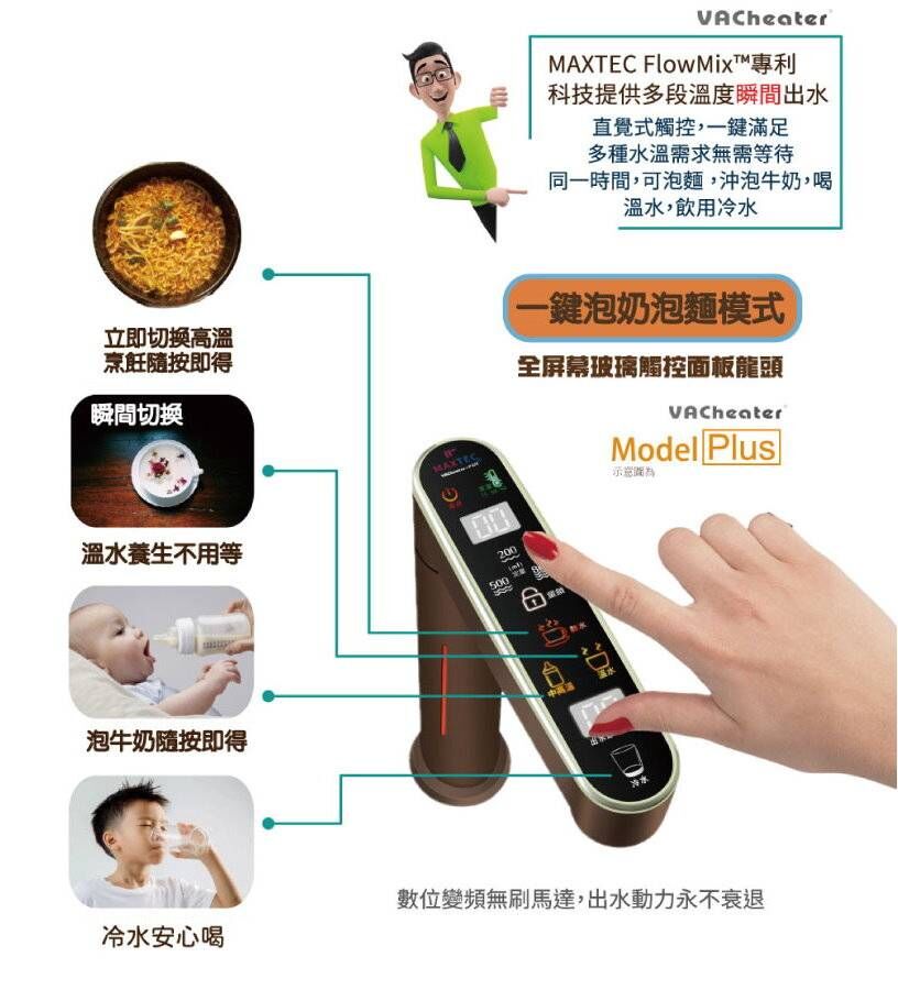 VACheater COMBO-PLUS 有「冷水 / 溫水 / 中高溫 / 熱水」四種即時溫度可以使用;龍頭上方有雙重顯示溫度螢幕 (可以顯示即時出水溫度);有「200 / 500 / 800ml」三種定量出水;龍頭及機身顏色為「摩卡棕、秋夜消光黑」。