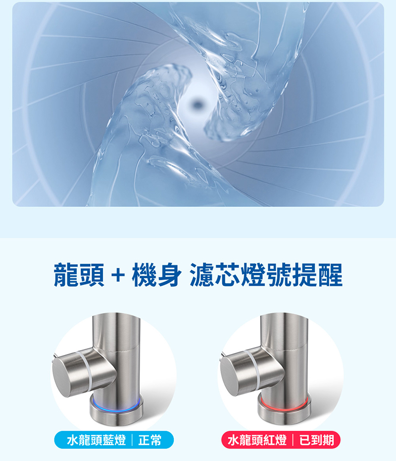 貼心提醒更換濾芯,龍頭、機身皆有濾芯亮燈更換提醒,隨時記錄用水狀況, 濾芯 快到期時即會亮燈提醒。