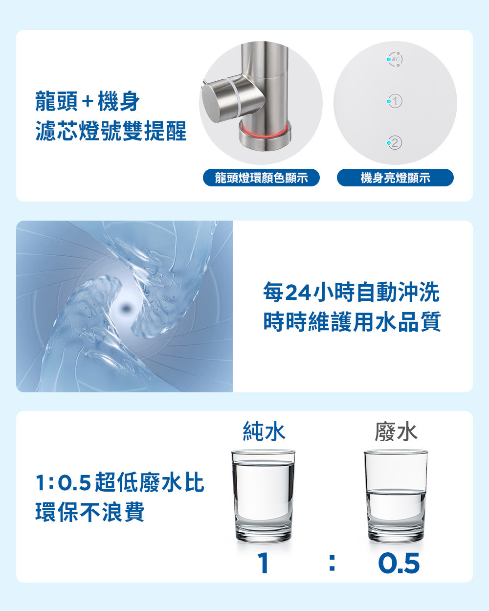 貼心提醒更換濾芯,龍頭、機身皆有濾芯亮燈更換提醒,隨時記錄用水狀況, 濾芯 快到期時即會亮燈提醒。