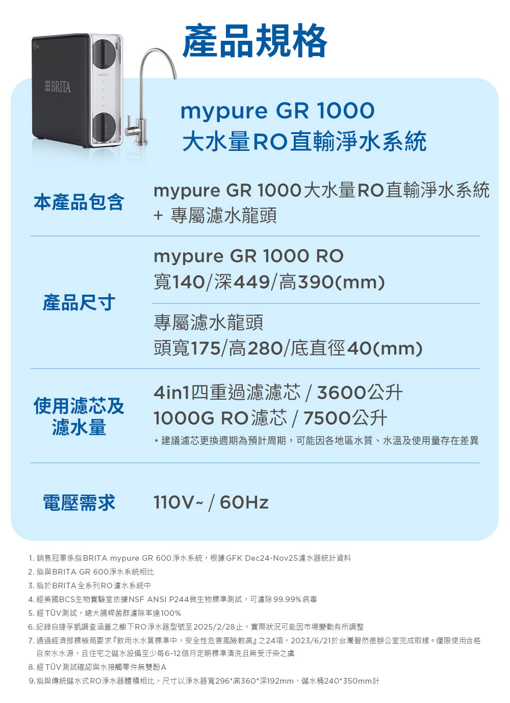 BRITA mypure GR1000 RO直輸淨水系統【商品規格】