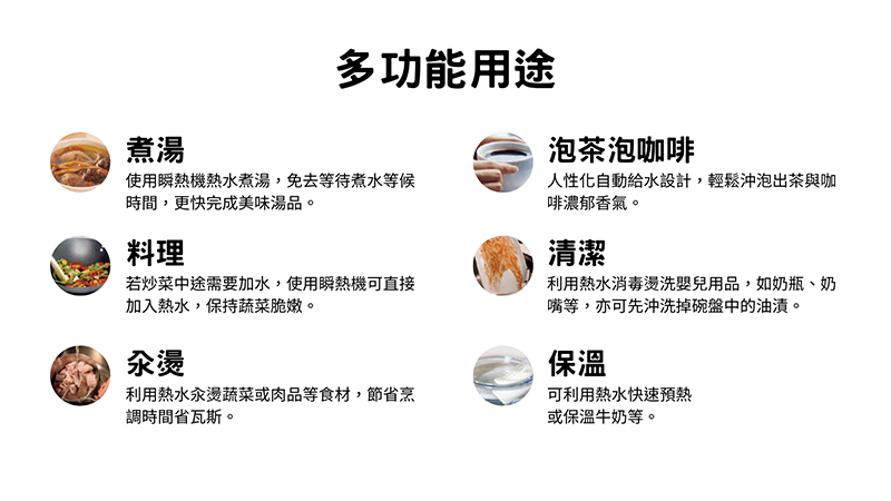 • 具備智慧型水量自動偵測裝置,可在水量不足時立即自動補水,防空燒不爆裂