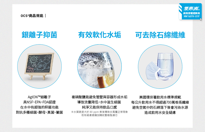 • 搭配愛惠浦PURVIVE-OCS2全效系列淨水器,內置複磷酸鹽及銀離子,能有效軟化水垢,並能抗水中多種類型的細菌、酵母、真菌、黴菌等等