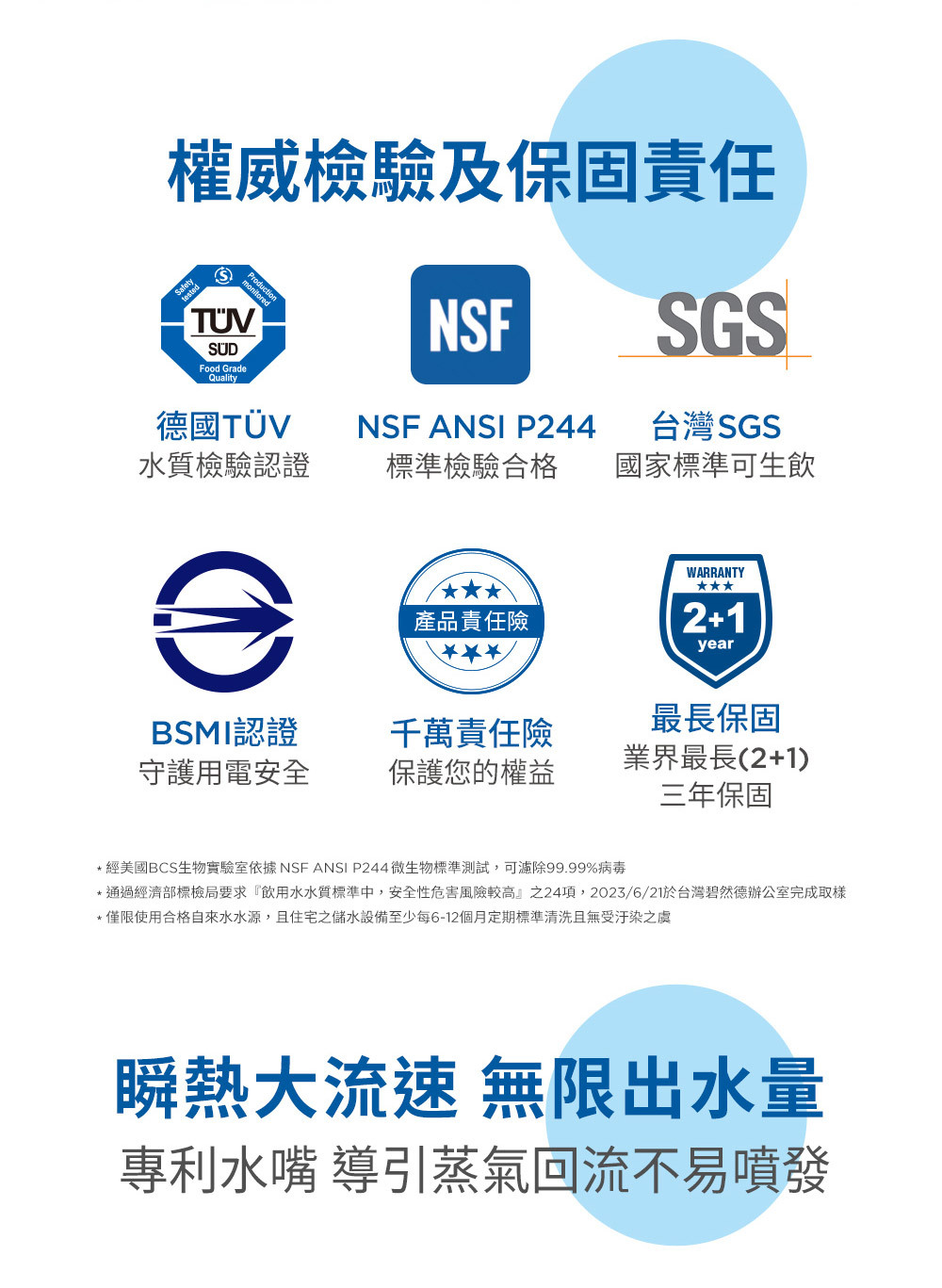 . 經NSF ANSI P244標準檢驗合格,台灣SGS檢驗符合國家標準可生飲