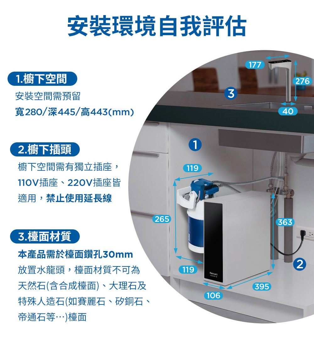 檯面材質若為木頭、塑料人造石、不鏽鋼,皆在標準安裝範圍內。若家中流理臺材質為水泥、陶瓷或大理石、石英石等天然石材(或高硬度人造石),須請廚具先鑽孔。*水龍頭鑽洞孔徑為3公分