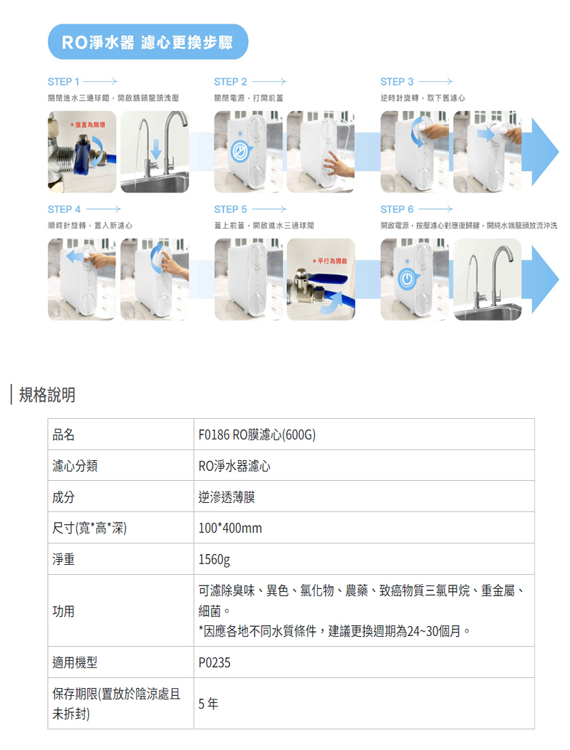 • 更換週期:因應各地不同水質條件,建議更換週期為24~30個月。