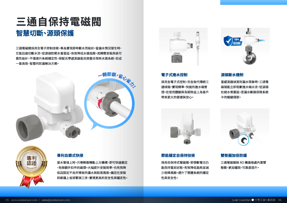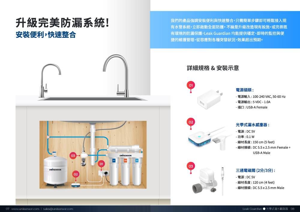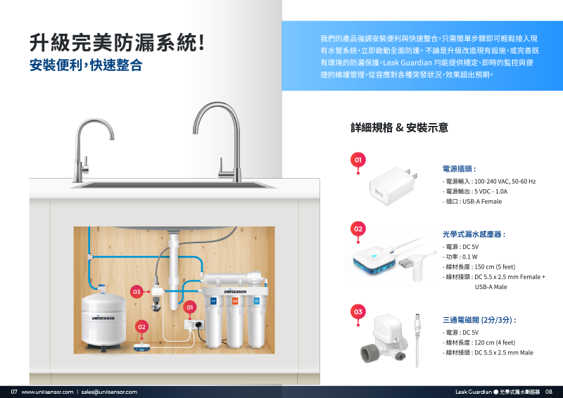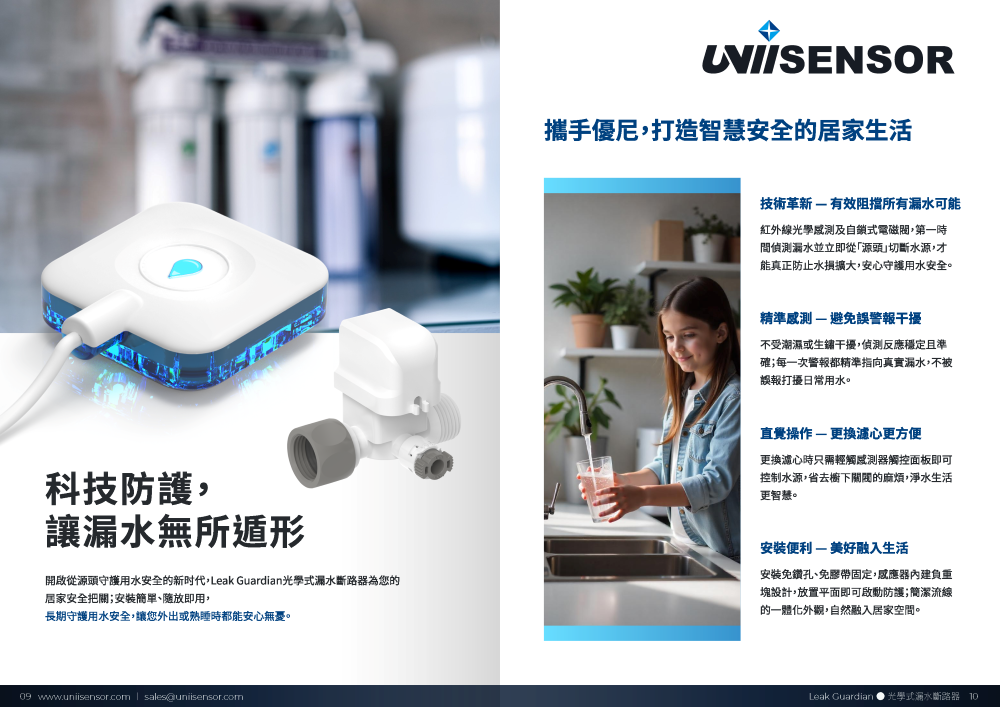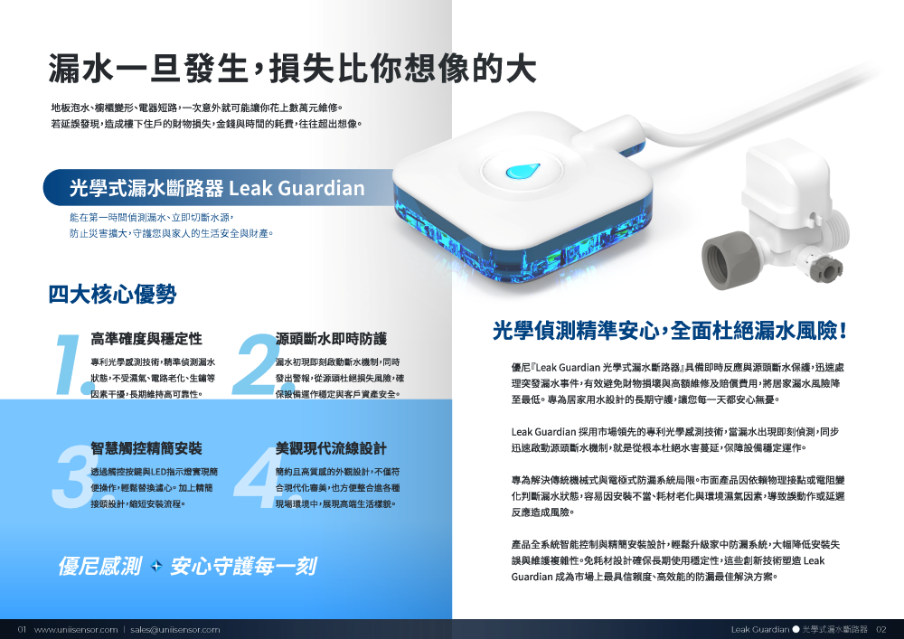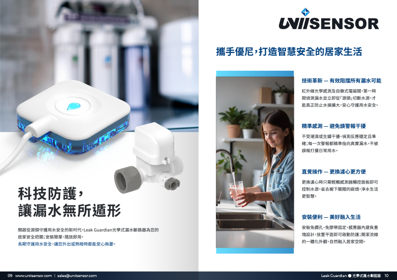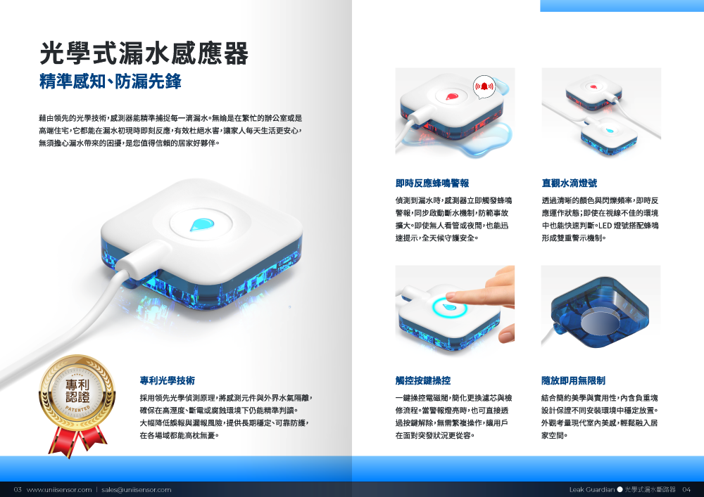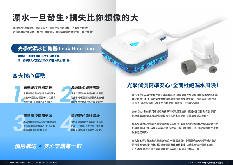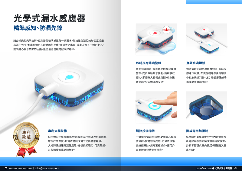 光學技術: 採用專利光學技術來感應漏水,將感測元件與外界水氣隔離,確保在高濕度、斷電或腐蝕環境下仍能精準判讀,大幅降低誤報風險。