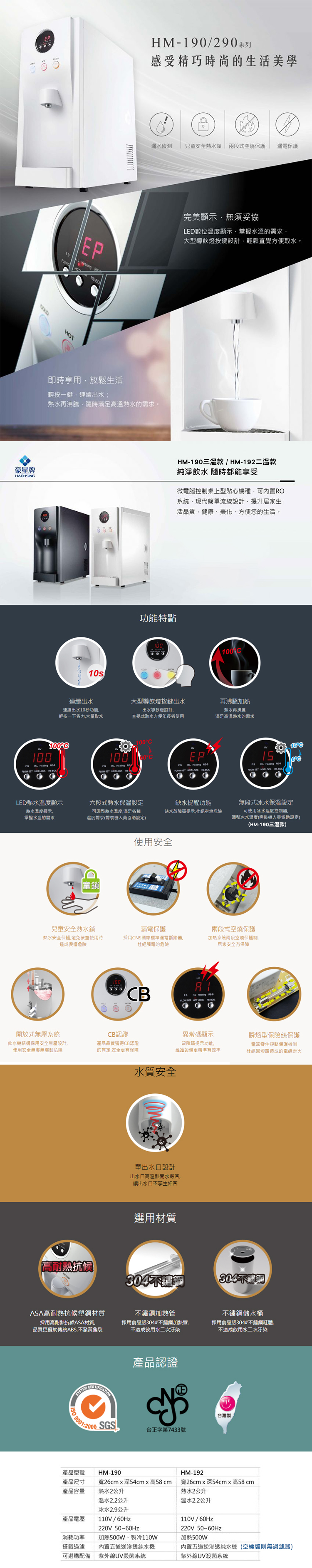 豪星 HM-193 冰冷熱三溫桌上型飲水機儲水量為熱桶2L、溫水2.2L、冰水2.9L。