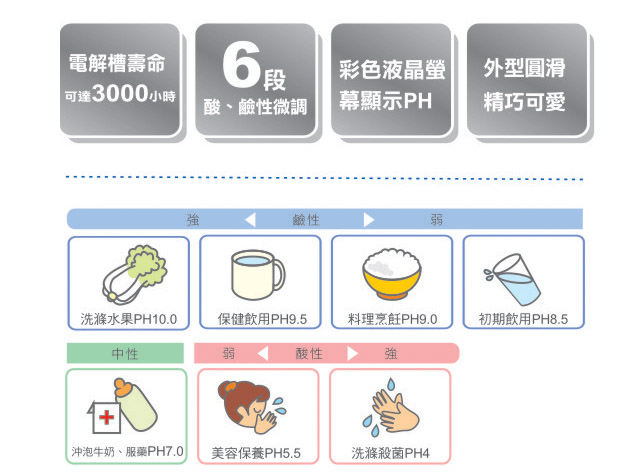 中性:pH 7.0,服藥、泡牛奶,鹼性離子整水器可有效去除鉛害及多種有害物質,並保留水中礦物質。