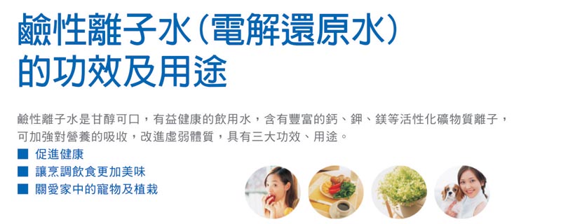 1.含礦物質的鹼性水:水經電解時,水中之鈣、鎂、鈉、鉀等正離子被陰極吸取後,氫氧離子增加而成鹼性,可中和體內酸毒,改變酸性體質。